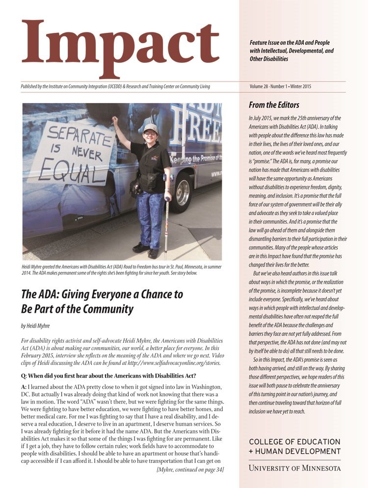 This issue marks the 25th anniversary of the Americans with Disabilities Act (ADA) with articles by individuals with disabilities, families, advocates, service providers, researchers, and others talking about how the ADA has made a difference in their lives, the lives of their loved ones, and in our nation. At the same time, this Impact also focuses on ways in which the ADA hasn’t fully addressed a number of the barriers faced by people with intellectual and developmental disabilities as they seek equal opportunity and inclusion in their communities. By sharing this range of perspectives, this Impact issue encourages readers to both pause to celebrate the anniversary of the ADA as a turning point in our nation’s journey, and continue traveling toward that horizon of full inclusion we have yet to reach. View the pdf version of the issue here. Get the text version.