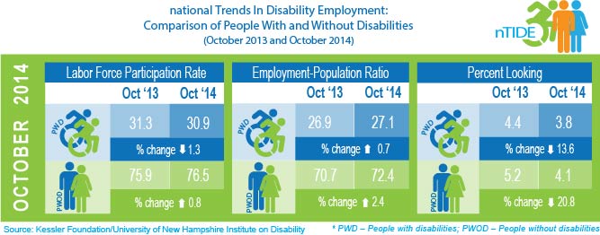 According to the National Trends in Disability Employment report, the employment-to-population ratio increased from 26.9 percent in October 2013 to 27.1 percent in October 2014 (up 0.7 percent; 0.2 percentage points) for working-age people with disabilities. The employment-to-population ratio, a key indicator, reflects the percentage of people who are working relative to the total population (the number of people working divided by the number of people in the total population multiplied by 100).